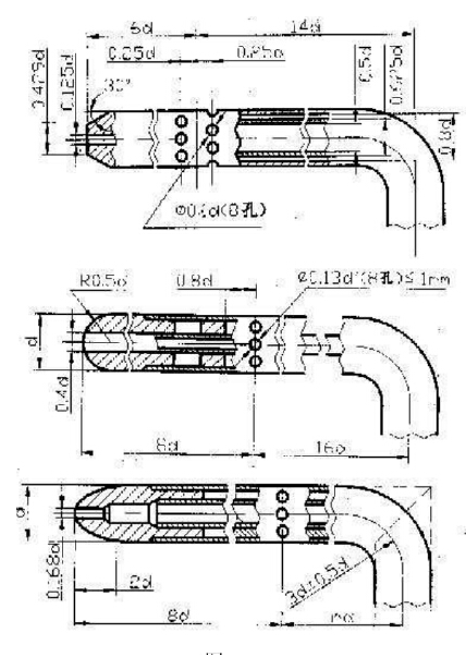 上圖是一般皮托管的結(jié)構(gòu),為了能看清,把兩端放大。如圖中可以看到皮托管外形是一個L型的金屬管,與管軸平行安置的直角邊是測頭,其頂端有一個總壓孔,在其側(cè)壁上有若干個靜壓孔。總壓孔與靜壓孔不相通,分別用導(dǎo)壓管引出,從靜壓孔至總壓孔稱為鼻端。直角的另一邊稱為支桿,引出總壓孔和靜壓孔的接頭以便與微壓計(jì)的管相連接。其上有定向桿,指示鼻端方向。測量總壓力的管子叫皮托管,測量靜壓力的管子叫靜壓管。實(shí)際上常用的都是皮托管和靜壓管的組合,而且多數(shù)使用實(shí)驗(yàn)系數(shù)接近為1的形狀,也*是國際標(biāo)準(zhǔn)推薦的GETIAT(錐形頭)型,AMCA型(球形頭),MPL型(橢圓形頭三種),如下圖所示