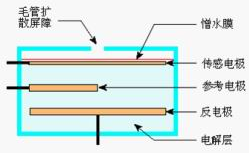 電化學(xué)測(cè)試方法又稱為定電位電解法,是*對(duì)二氧化硫的標(biāo)準(zhǔn)測(cè)定方法之一。(HJ/T 57-2000《固定污染源排氣中二氧化硫的測(cè)定定電位電解法》)。其核心器件電化學(xué)傳感器的結(jié)構(gòu)如圖。